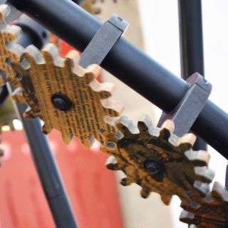 Cada engrane es una pieza única y posee una huella distintiva del ejemplar al que perteneció. La materia prima de los engranes se compone por libros de texto editados desde los 60 hasta versiones del año 2000.
