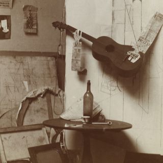 Picasso leía los periódicos parisinos "Le Journal" y "Excelsior", impresos en un papel barato que se oscurecía con rapidez, y que empleó en sus collages, a los que añadió también papel de pared con estampados vegetales y partituras reales de "Sonnet", una canción popular en la capital francesa a principios del siglo XX.