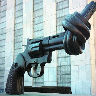 El logotipo de la fundación Non Violence Project es una figura en honor a John Lennon (1940-1980), quien fuera pareja sentimental de Yoko Ono, a través del cual se expresa que se está en contra del uso de las armas.