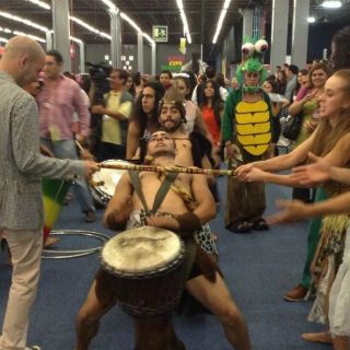 GUADALAJARA, JALISCO (24/ABR/2013).- Los cavernícolas de Circo Dragón bailaron al ritmo de tambores africanos para celebrar la inauguración de Papirolas 2013. Bajo el lema Imaginar es Divertido, la 18 edición del festival creativo para niños, niñas y jóvenes, que abrió sus puertas la mañana de este miércoles, ofrece múltiples actividades enfocadas en tres manifestaciones artísticas contemporáneas: el Cómic, la Animación y la Tecnología.