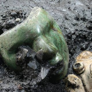 De las tres piezas de piedra verde, destacó el arqueólogo, sobresale una extraordinaria máscara antropomorfa que fue tallada en una sola pieza, cuyos ojos fueron hechos con concha y pirita.