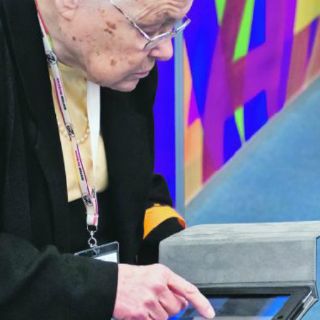 GUADALAJARA, JALISCO (01/DIC/2011).- ¿Quién dijo que para la tecnología hay edades? Esta mujer de la tercera edad usa su tableta dentro de la Feria Internacional del Libro (FIL) de Guadalajara.