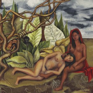 "Dos desnudos en el bosque", de tan solo 30 centímetros de ancho por 25 de largo (casi 12 por 10 pulgadas), muestra a dos mujeres desnudas descansando en un bosque. La artista le obsequió la obra de 1939 a su compatriota Dolores del Río, una de las primeras actrices latinoamericanas que triunfó en Hollywood.