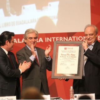 FIL 2015 al recibir el Premio en Lenguas Romances de la Feria Internacional del Libro de manos del Gobernador de Jalisco,