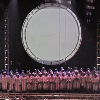 En escena el coro estuvo ubicado en un primer nivel, donde las túnicas blancas dejaban ver sólo el rostro de los cantantes. En un segundo nivel, una pantalla simulaba un espejeo que reflejó al mundo y sus bellezas, sin dejar de lado las desgracias y la guerra.