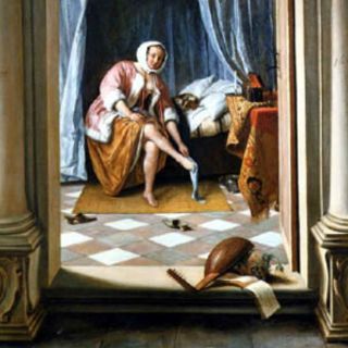 Otra de las obras destacadas es “Mujer en el lavabo”, de Jan Steen, que representa a una mujer joven justo en el momento en que se está quitando el calcetín “a juzgar por las marcas que vemos en su pantorrilla”, explicó el comisario.