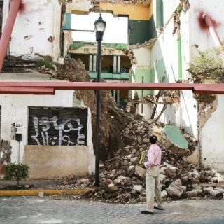 GUADALAJARA, JALISCO (08/JUN/2015).- Entre escombros se sostiene, a punto del colapso, un laberinto de pisos, muros y techos. Al caminar o transitar en vehículo por la calle independencia al cruce con Dr. Baeza Alzaga en el centro de Guadalajara, es casi imposible evitar ver esta finca.