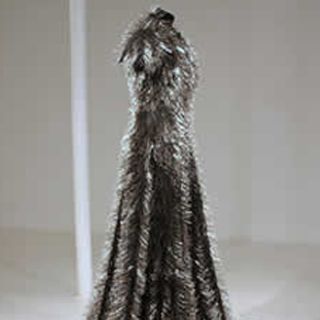Entre las piezas que más llaman la atención está la titulada "Widow" (Viuda) un elegante vestido hecho enteramente con agujas, de Susie MacMurray, que parece apuntar a la habilidad de las costureras pero también evocar un dolor punzante.