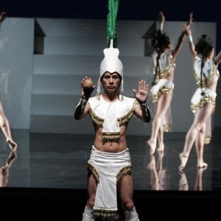 En medio del escenario, que representaba el trono de un emperador y en los costados resaltaron las imágenes prehispánicas, la obra inició con una función circense, en la que una mujer hizo malabares con antorchas encendidas, pero haciéndolo acostada.