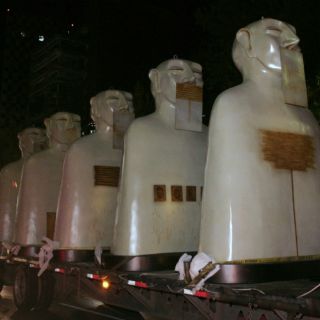 En punto de las 22:45 horas, inició ese paseo desde un costado del edificio de la Lotería Nacional, donde dos tractocamiones y un camión rabón con grúa aparecieron para desfilar sobre Paseo de la Reforma con las monumentales piezas.