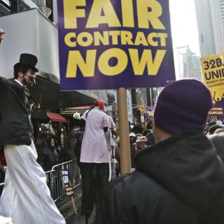 Algunos empleados se manifestaron el miércoles en el centro de Manhattan con pancartas de protesta para expresar su decepción por las conversaciones mantenidas hasta el momento con la patronal.