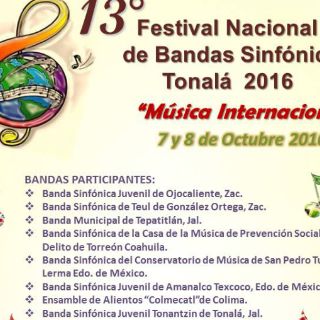 GUADALAJARA, JALISCO (06/OCT/2016).- El viernes 7 y sábado 8 de octubre se llevará a cabo el 13vo Festival Nacional de Bandas Sinfónicas Tonalá 2016. El festival es único en el estado de Jalisco y estárá a cargo del Maestro Manuel Cerros Guevara.