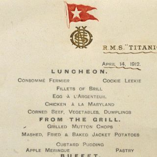 Un coleccionista del Reino Unido compró el menú que Ruth Dodge, una pasajera que viajaba a Estados Unidos con su marido, un banquero de San Francisco (oeste de Estados Unidos), y su hijo, había guardado en su cartera.