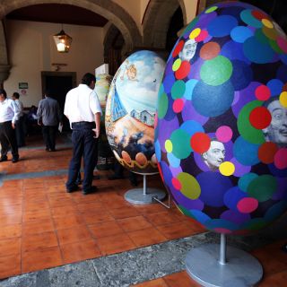 GUADALAJARA, JALISCO (13/JUN/2011).- ¿Qué fue primero, el huevo o la gallina? Para la exposición pictórica instalada en el Congreso del Estado de Jalisco, aún no queda clara la respuesta, pero un gallo posado en lo alto de un huevo de alrededor de dos metros de altura parece poner fin a este dilema. Junto a él, colocados en círculos, otros treinta huevos de la misma medida cuentan historias donde el huevo es el escenario principal.