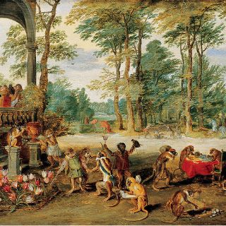 Pintura satírica donde un grupo de monos vestidos elegantemente representa diversas actitudes reinantes en el mercado de los tulipanes