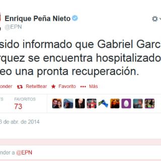 El mandatario utilizó su cuenta de Twitter para publicar el siguiente mensaje: "@EPN: He sido informado que Gabriel García Márquez se encuentra hospitalizado. Le deseo una pronta recuperación".