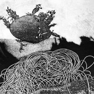 Algunas de las piezas de “Vueltas del tiempo” –recuerda Downes- se imprimieron en el taller de serigrafía que fundó con Adriana Alaniz, en 1982; en tanto que otros grabados de mayor formato proceden del taller de Pilar Bordes, Cornelio García y de Alejandro Ehrenburg.