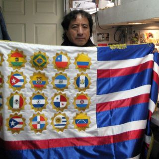 ''El ser latino se siente más aquí, en Estados Unidos. Aquí convivimos todos juntos'', dijo el artista peruano de 48 años que ha bordado una bandera multicolor que incluye 20 escudos con las banderas de los países de América Latina.