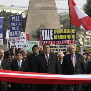LIMA, PERÚ (06/NOV/2010).- Con el presidente Alan García a la cabeza, cerca de un millar de peruanos marcharon hoy en el centro de Lima para exigir a la universidad estadounidense de Yale la devolución de las piezas arqueológicas de Machu Picchu.