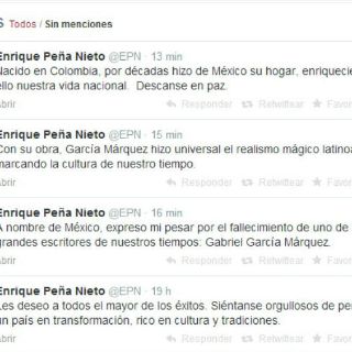 Utilizando su cuenta de Twitter ( @EPN) el mandatario dijo: "A nombre de México, expreso mi pesar por el fallecimiento de uno de los más grandes escritores de nuestros tiempos: Gabriel García Márquez".