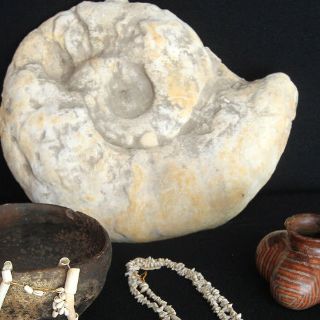 Dentro de las piezas más destacadas se encuentran una olla de barro fitomorfa, pequeños caracoles marinos cuidadosamente perforados, que posiblemente formaron parte de un sartal (collar), tres fósiles de animales marinos y un amonite (molusco) de 40 centímetros de diámetro.