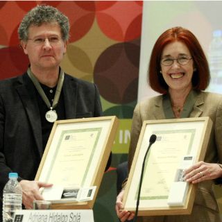 GUADALAJARA, JALISCO (26/NOV/2012).- "Producir buenos textos para el lector para evitarle esa abrumadora cantidad de fluidos, neutralizada por sí misma", es la sustancia de la labor de un editor, explicó Fabián Lebenglik con la medalla del Reconocimiento al Mérito Editorial puesta. "Nos reafirma en el camino elegido", dijo Adriana Hidalgo Solá, también galardonada.