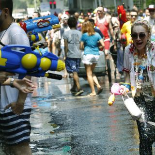 Cientos de personas protagonizan una verdadera batalla campal armadas con todo tipo de pistolas y bazocas de juguete con las que disparan agua a diestro y siniestro para celebrar Songkran, la festividad que señala el fin de la época seca y que precede a las lluvias del monzón.