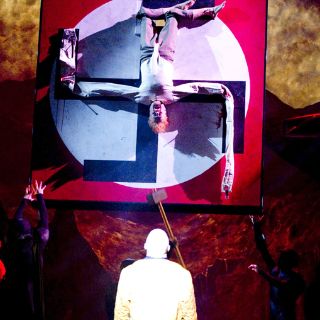 Y en las dramáticas escenas finales, Margarita espera el tren que la llevará, junto a otras víctimas judías, al campo de exterminio, mientras Fausto, montado en una moto con sidecar junto a Mefistófeles, corre hacia el abismo para acabar crucificado con una especie de camisa de fuerza sobre una enorme esvástica.