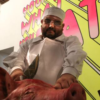 GUADALAJARA, JALISCO (10/SEP/2011).- Un banquete totalmente fuera de lo común se ofreció ayer por la noche en la galería de Arte Contemporáneo Arena México. El encargado del menú fue el artista Javier Pulido mejor conocido como Monster Truck, quien enfundado en un traje blanco de carnicero recibió a los 'comensales' para presentar Eat Diviness, un proyecto de arte pensado como un burdo filme hollywoodense compuesto por instalaciones, dibujos, pinturas, esculturas y performance que giran alrededor del cerdo como símbolo de la sociedad capitalista.