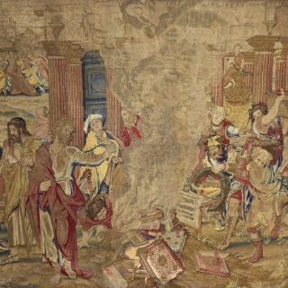 MADRID, ESPAÑA (08/MAY/2014).- "San Pablo quemando los libros paganos" es uno de los tapices desaparecidos de la colección de Enrique VIII, que lo tuvo como su "cuarta mejor pieza" y ahora ha "emergido" en España, en la galería madrileña Coll&Cortés, que lo exhibirá hasta el 8 de junio tras habérselo comprado a un vendedor anónimo.