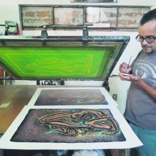 La mayoría de las piezas son obra gráfica, salvo unas cuantas piezas originales de mayor tamaño. Entre las técnicas utilizadas hay xilografía, serigrafía, aguafuerte, aguatinta y grabado en madera. Por lo regular son de pequeño formato, algunos de 25 x 25 centímetros, los más grandes de poco más de un metro cuadrado. En total suman casi 40 obras las que se expondrán en esta cafetería que abre también sus puertas al arte.