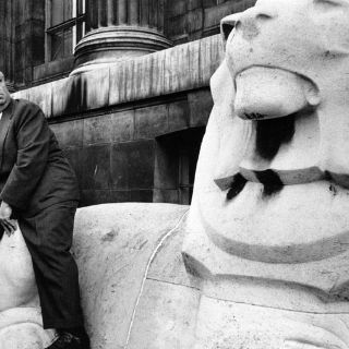 El británico cuenta con la complicidad de Alfred Hitchcock en una de las imágenes expuestas, en la que el realizador cinematográfico, con gesto inquieto, mira a uno de los leones en el exterior del Museo Británico.