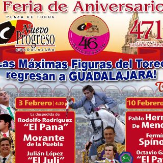 GUADALAJARA, JALISCO (11/ENE/2013).- A través de un comunicado la empresa Espectáculos Taurinos de México SA de CV da a conocer el cartel con motivo de los festejos del 46 aniversario de la Plaza de Toros Nuevo Progreso y del 471 aniversario de la fundación de esta ciudad.