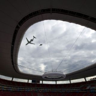 GUADALAJARA, JALISCO (15/OCT/2011).- Justo cuando el reloj marcaba las 17:15 horas, sobre el Estadio Omnilife, sede de la Ceremonia de Inauguración de los Juegos Panamericanos, el avión presidencial atravesó el espacio aéreo escoltado por dos aeronaves de la Fuerza Aérea Mexicana.
