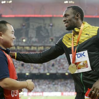 CIUDAD DE MÉXICO (28/AGO/2015).- Usain Bolt se reencontró con el camarógrafo que lo arrolló este jueves cuando celebraba su oro mundial de los 200 metros en el estadio Nacional de Beijing.