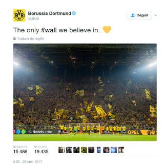 Por medio de su cuenta oficial de Twitter, el cuadro teutón publicó una imagen de sus jugadores formando una valla frente a la portería, donde al fondo se visualiza la afición que, según señalan, es considerada de las más leales del planeta. Así mismo, junto a la fotografía se colocó un mensaje en inglés que dice “El único muro en el que creemos”, en alusión al presidente estadounidense.