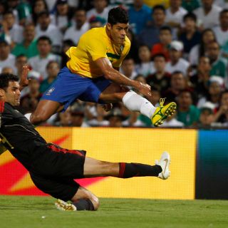 TORREÓN, COAHUILA (11/OCT/2011).- La jerarquía de los pentacampeones del mundo se desparramó en la cancha del Estadio Corona TSM para sobreponerse a una desventaja en el marcador y a la expulsión de Daniel Alves para la victoria de Brasil por 2-1 sobre México, que amargó el adiós del arquero Oswaldo Sánchez.