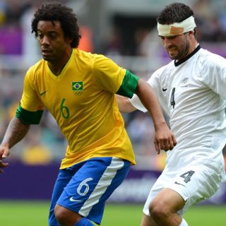NEWCASTLE, INGLATERRA (01/AGO/2012).- El madridista Marcelo ha dirigido la goleada (3-0) con la que Brasil se ha impuesto a Nueva Zelanda en Newcastle y que ha certificado a los de Mano Menezes como campeones del Grupo C de la Fase de Grupos del torneo olímpico masculino de futbol.