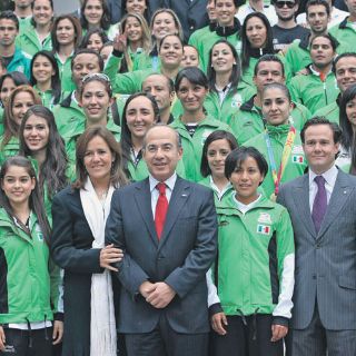 Rodeado de la delegación mexicana que participó en los Juegos Panamericanos de Guadalajara, el Presidente Felipe Calderón afirmó: “Por supuesto que los respaldo”.