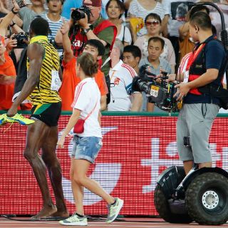 campeón del mundo de 200 metros, el jamaicano Usain Bolt fue derribado por un camarógrafo que lo filmaba al borde de la pista.
