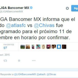 Es así, como el partido correspondiente a la Jornada 14 del Torneo Apertura 2015 entre Atlas y Chivas se reprograma el 11 de noviembre a las 20:30 horas.