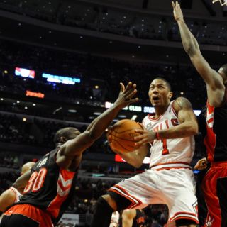 CHICAGO, ILLINOIS (03/ABR/2011).- El base Derrick Rose logró un doble-doble de 36 puntos y 10 asistencias, con lo que llevó a los Toros de Chicago a un triunfo por 113-106 sobre los Raptors de Toronto.