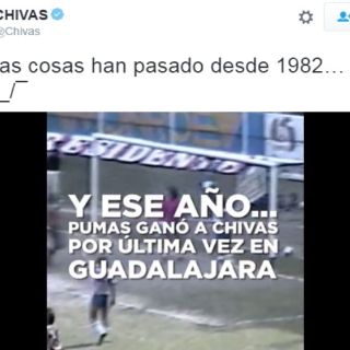 En esta ocasión, el primero en pegar fue el Rebaño que en su cuenta de Twitter publicó una secuencia de imágenes rememorando lo que sucedía en el mundo hace 34 años: López Portillo era presidente de México, se formaba Timbiriche... "y ese año Pumas le ganó a Chivas por última vez en Guadalajara".