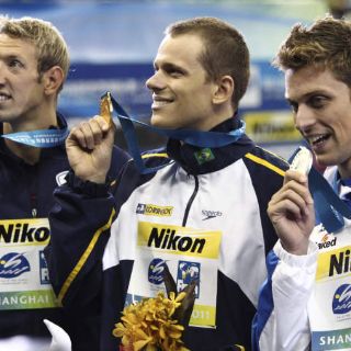 SHANGHAI, CHINA (30/JUL/2011).- El brasileño César Cielo ganó la medalla de oro en los 50 metros libre por delante del italiano Luca Dotto y del francés Alain Bernard, en los campeonatos del mundo de Shanghái.