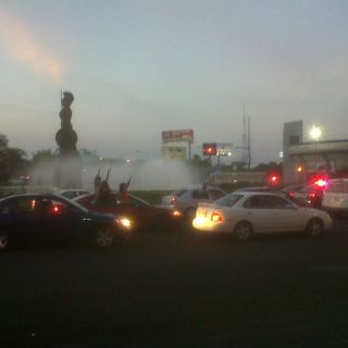 GUADALAJARA, JALISCO (10/ABR/2011).- Por lo menos un centenar de personas se apuestan sobre las banquetas que rodean la Glorieta de La Minerva, mientras que los automóviles que entran a la ciudad por Avenida Vallarta dan vueltas al monumento, en ruidoso y alegre festejo después que el juego de futbol entre Chivas y América terminó con un triunfo para el equipo tapatío.