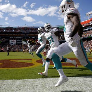 LANDOVER, MARYLAND (13/SEP/2015).- Jarvis Landry devolvió 69 yardas una patada para touchdown cuando restaban 10.22 minutos por jugares para dar a Miami su primera delantera del juego y los