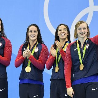RÍO DE JANEIRO, BRASIL (10/AGO/2016).- El relevo femenino estadounidense de los 4x200 m libres se llevó el oro en la prueba con un espectacular último relevo de su nadadora estrella Katie Ledecky, que suma así su cuarta medalla olímpica en Rio-2016, tres oros y una plata.