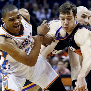 PHOENIX, ESTADOS UNIDOS (11/FEB/2013).- El escolta suizo Thabo Sefolosha anotó cinco triples, su mejor marca de temporada en esta faceta del juego, y el base Russell Westbrook anotó 24 puntos que ayudaron a los Thunder de Oklahoma City a ganar a domicilio (69-97) ante los devaluados Suns de Phoenix.