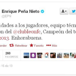 En su cuenta oficial de Twitter, el mandatario escribió: "Felicidades a los jugadores, equipo técnico y afición del @clubleonfc, Campeón del torneo #AP2013. Enhorabuena".