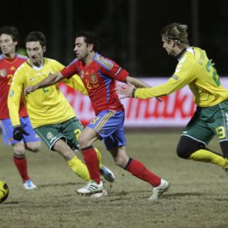 BARCELONA, ESPAÑA (29/MAR/2011).- El barcelonista Xavi Hernández, que disputó su partido 101 con la camiseta de España, marcó el primero de los tres goles de la campeona del mundo ante Lituania, a la que venció por 1-3 "a pesar del estado del campo, que era lamentable" en el estadio Steponas Darius y Stasis Girenas de Kaunas.